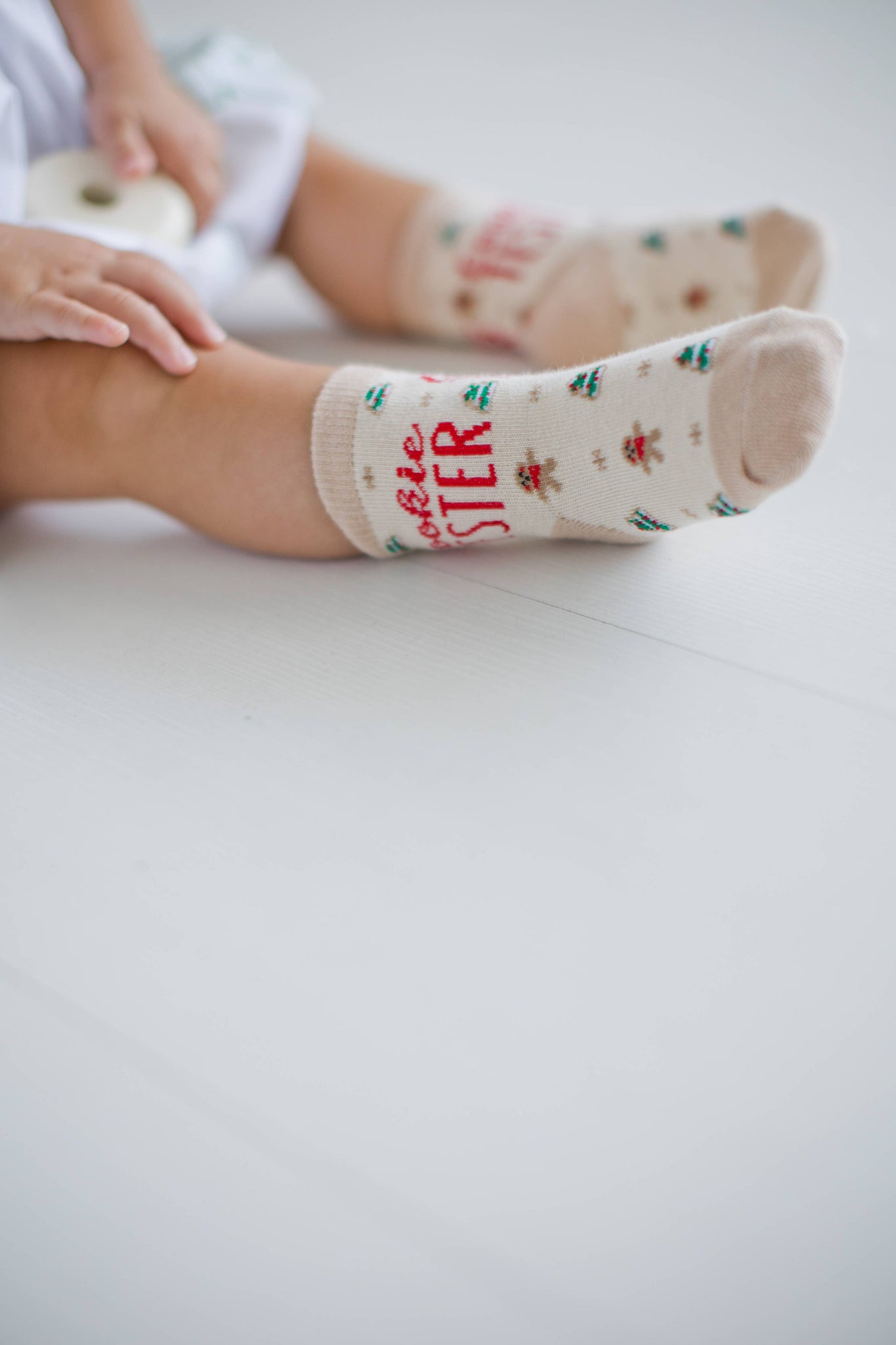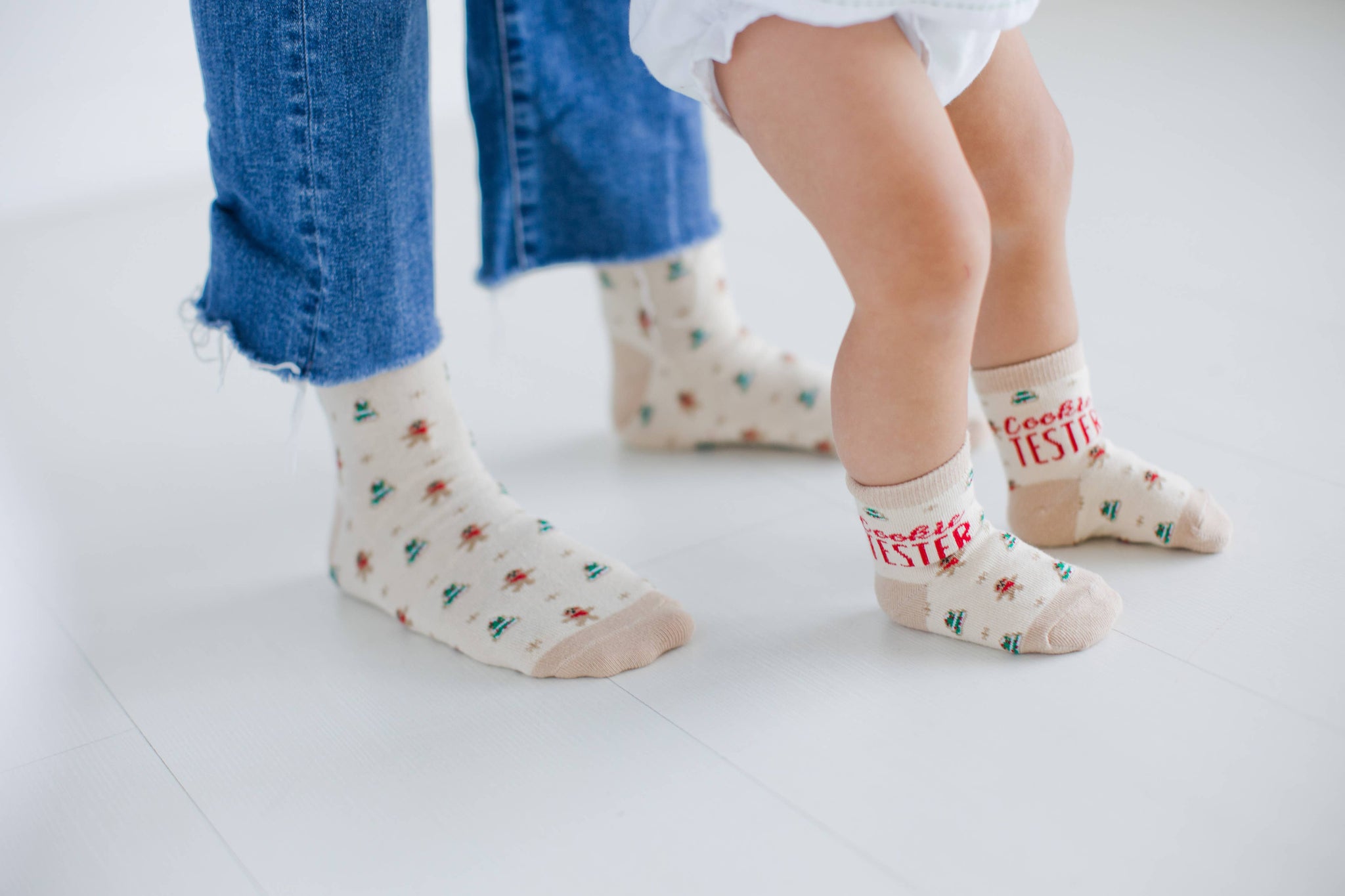 Fun holiday text: “Cookie Baker” on the parent socks and “Cookie Tester” on the toddler socks