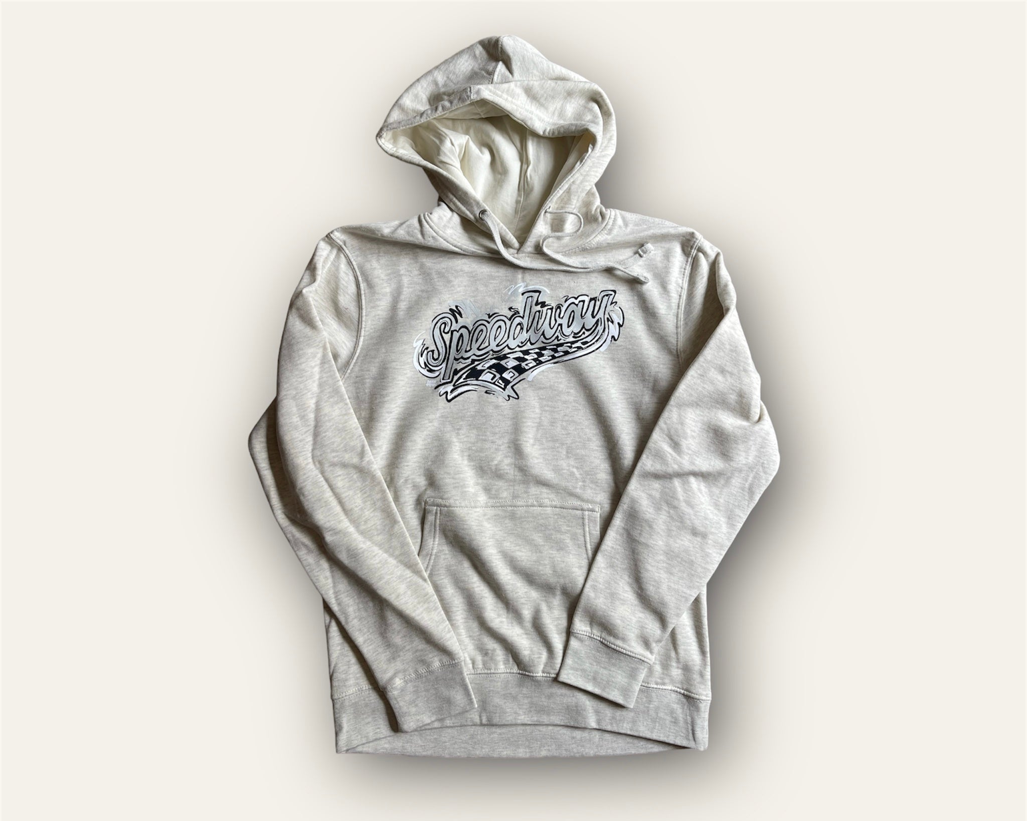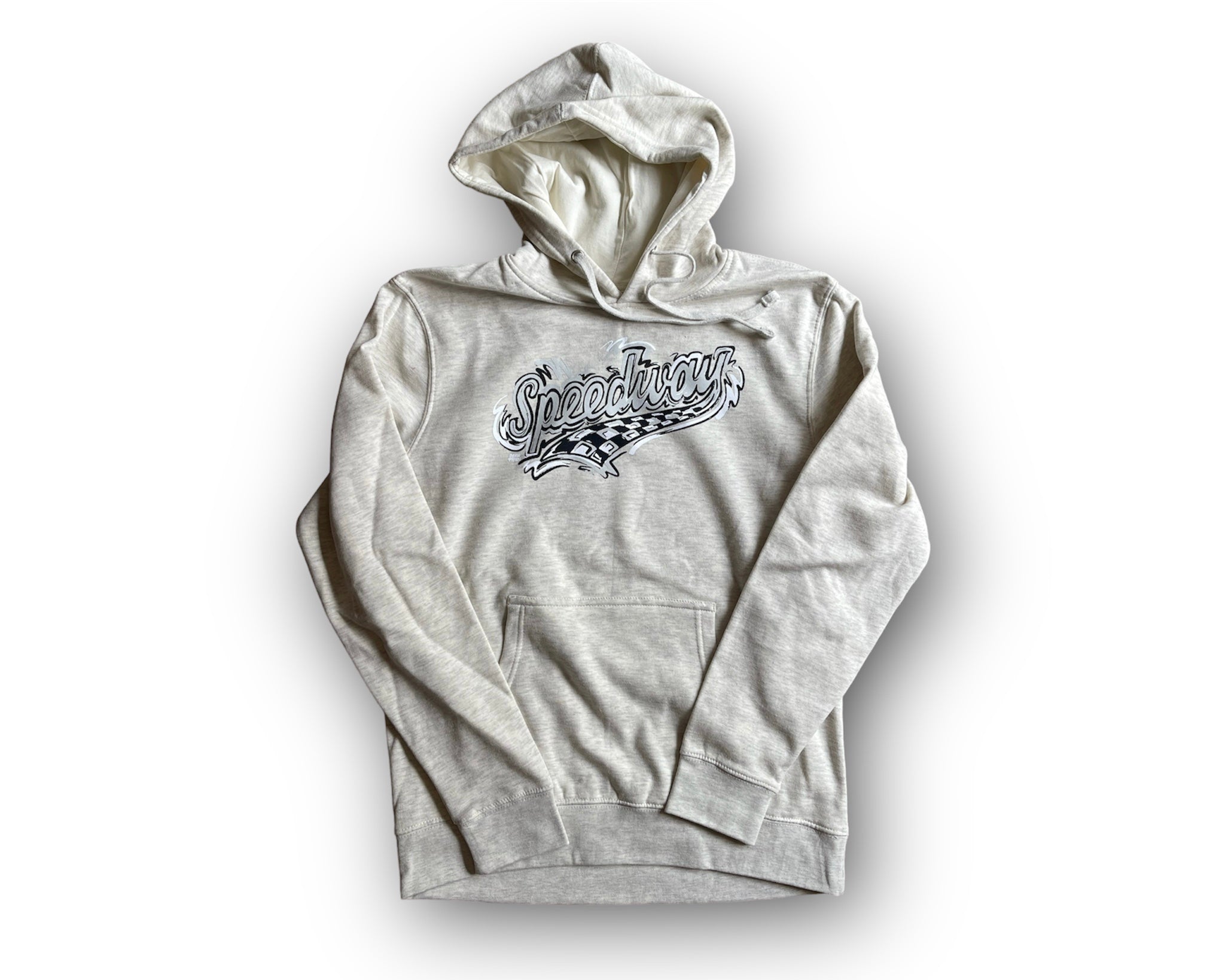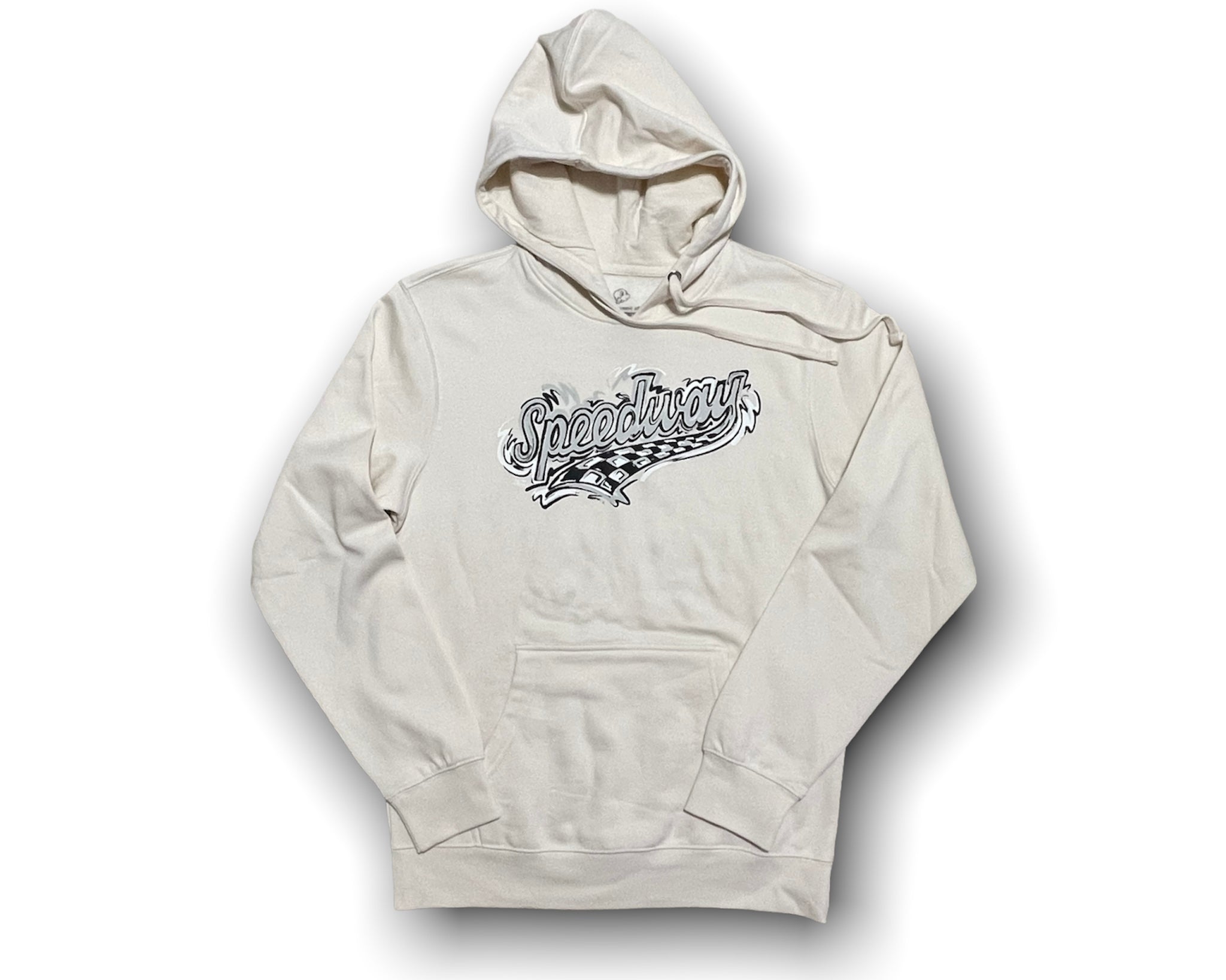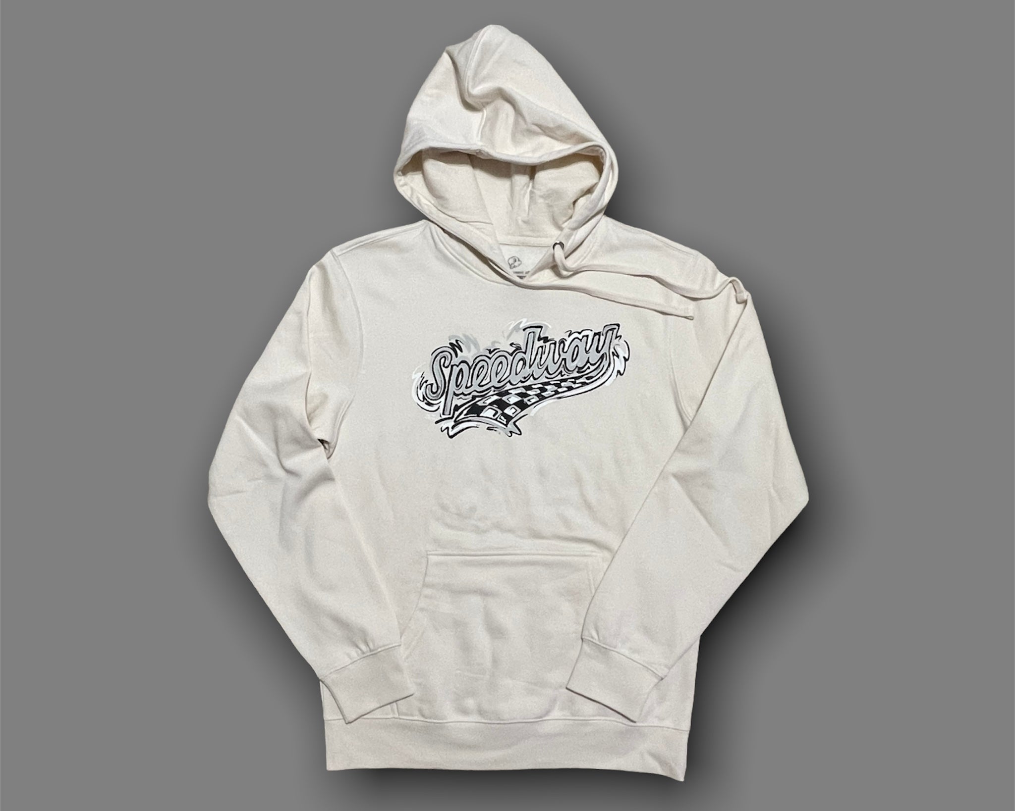 Represent Speedway with this new clean hoodie for spring.Sizing:The unisex fleece hoodie is a traditional cut for men and women. It runs true to size.Fabrication:52% Airlume combed and ring-spun cotton, 48% poly.Design created by Justin Patten.© Justin Patten. All rights reserved.