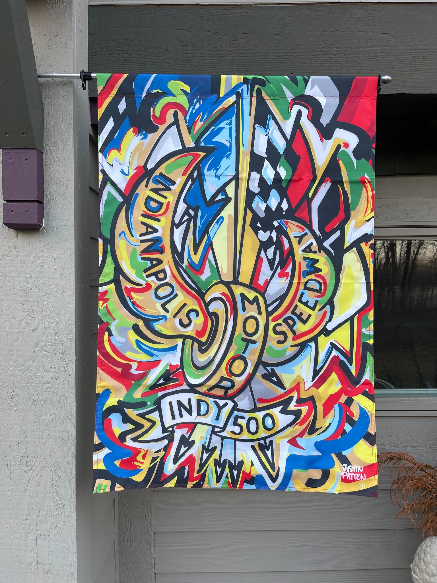 Justin Patten brings his unique, artistic style to the world of racing with this exclusive IMS licensed flag.