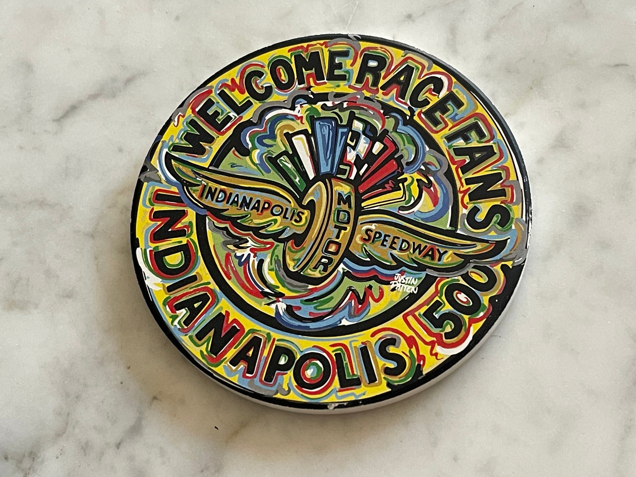 Justin Patten brings his unique, artistic style to the IMS Wing and Wheel logo with this stone coaster.