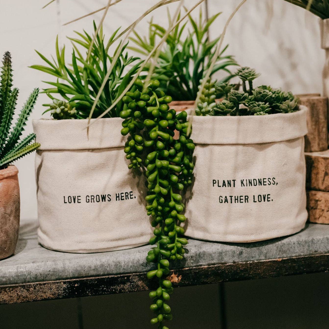 A note from the artist: These cozy little canvas planters are perfect for your little plant babies. Each one is lined with plastic to make them waterproof. And as somebody once wisely said, If speaking kindly to plants helps them grow imagine what speaking kindly to humans can do.