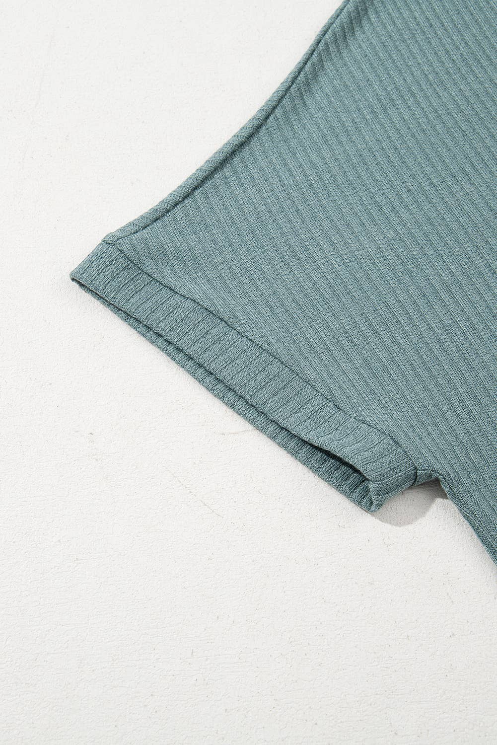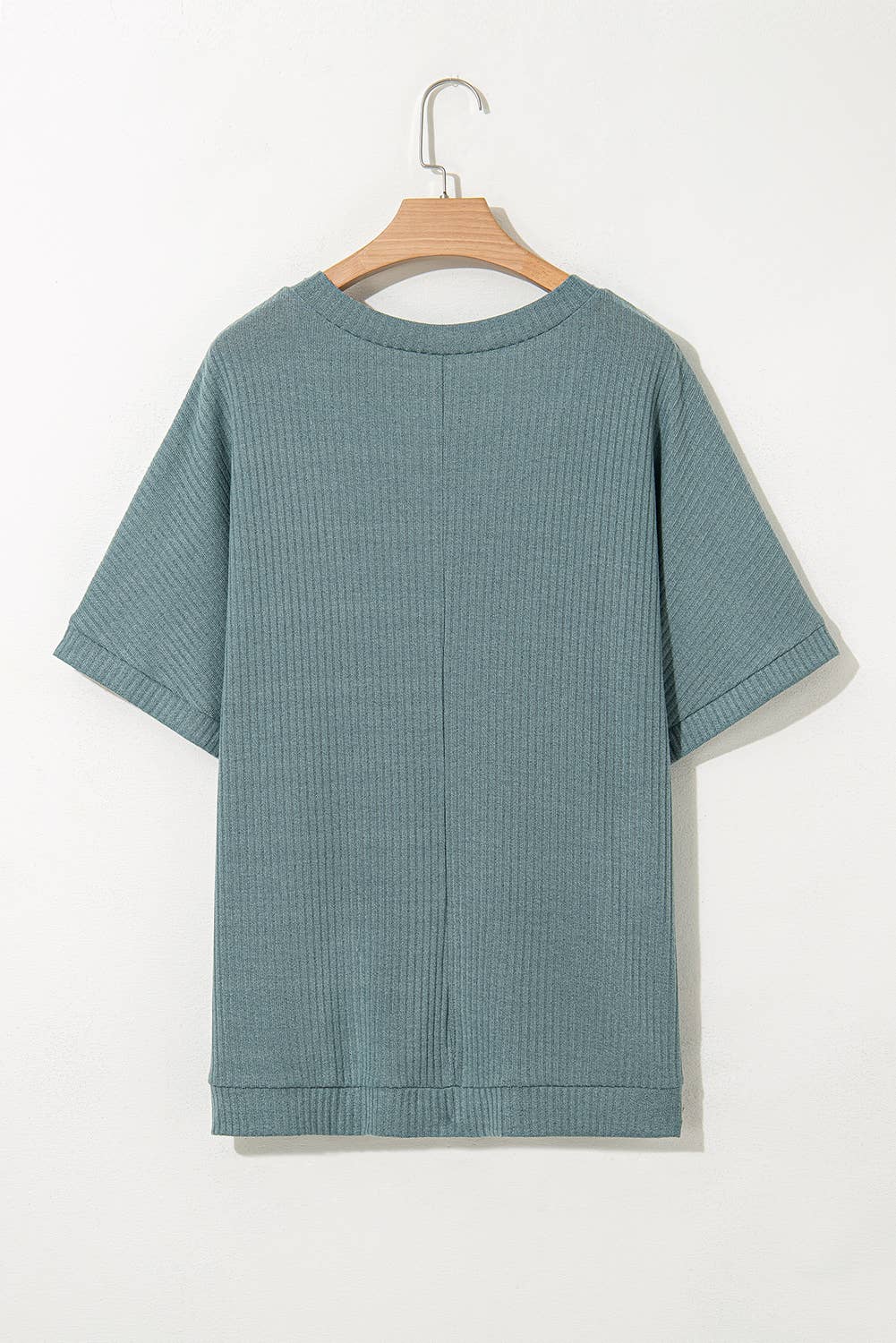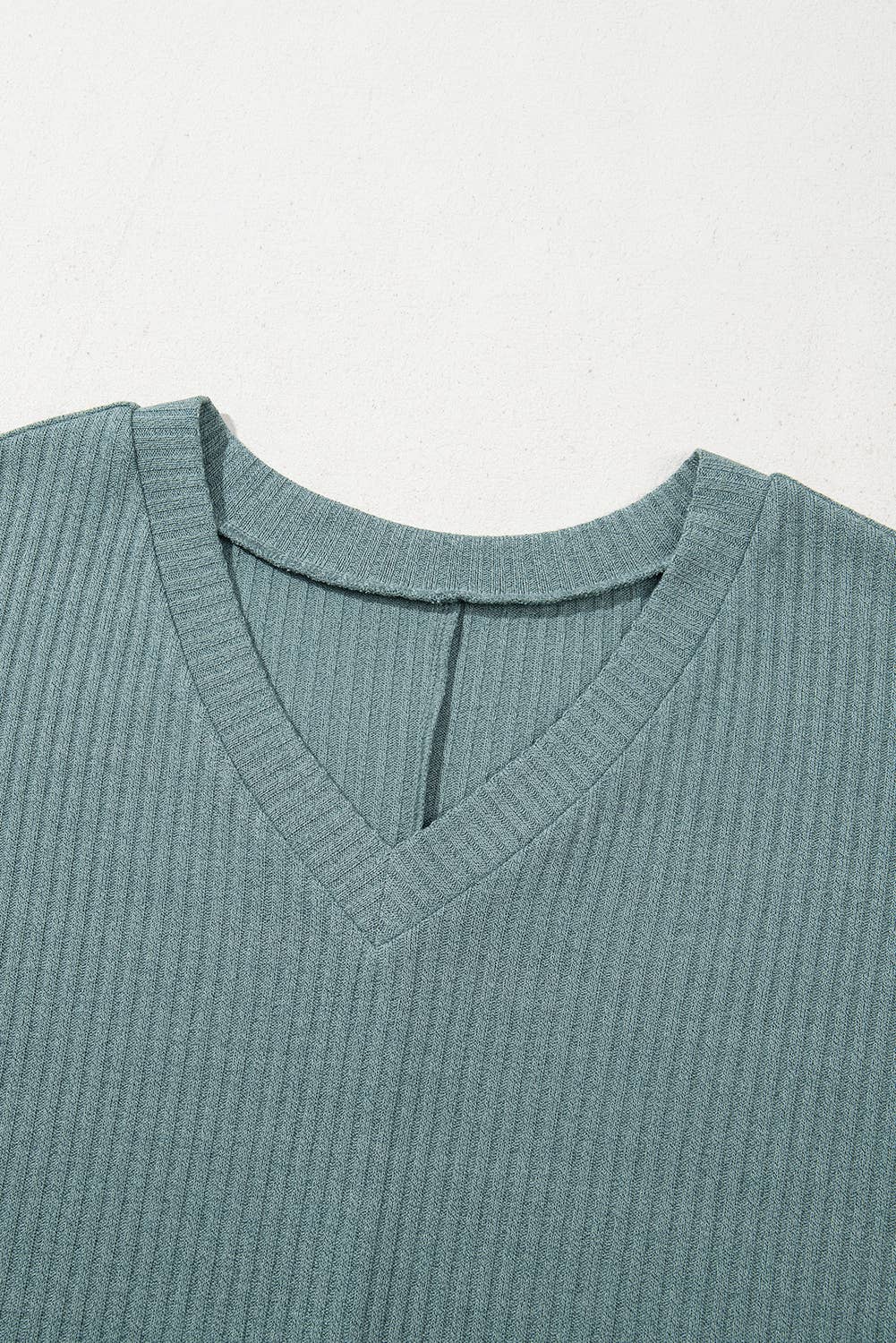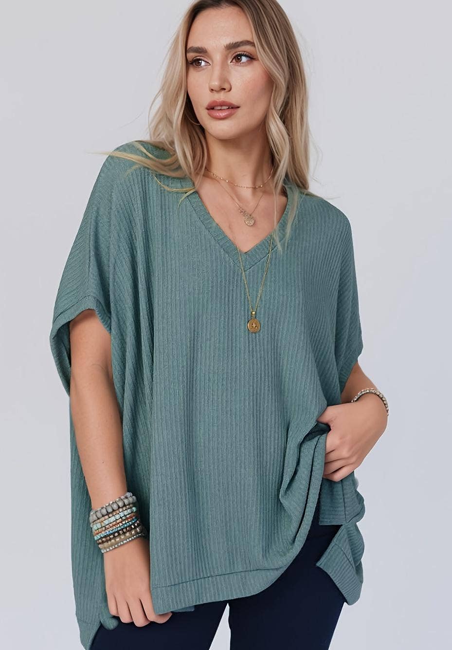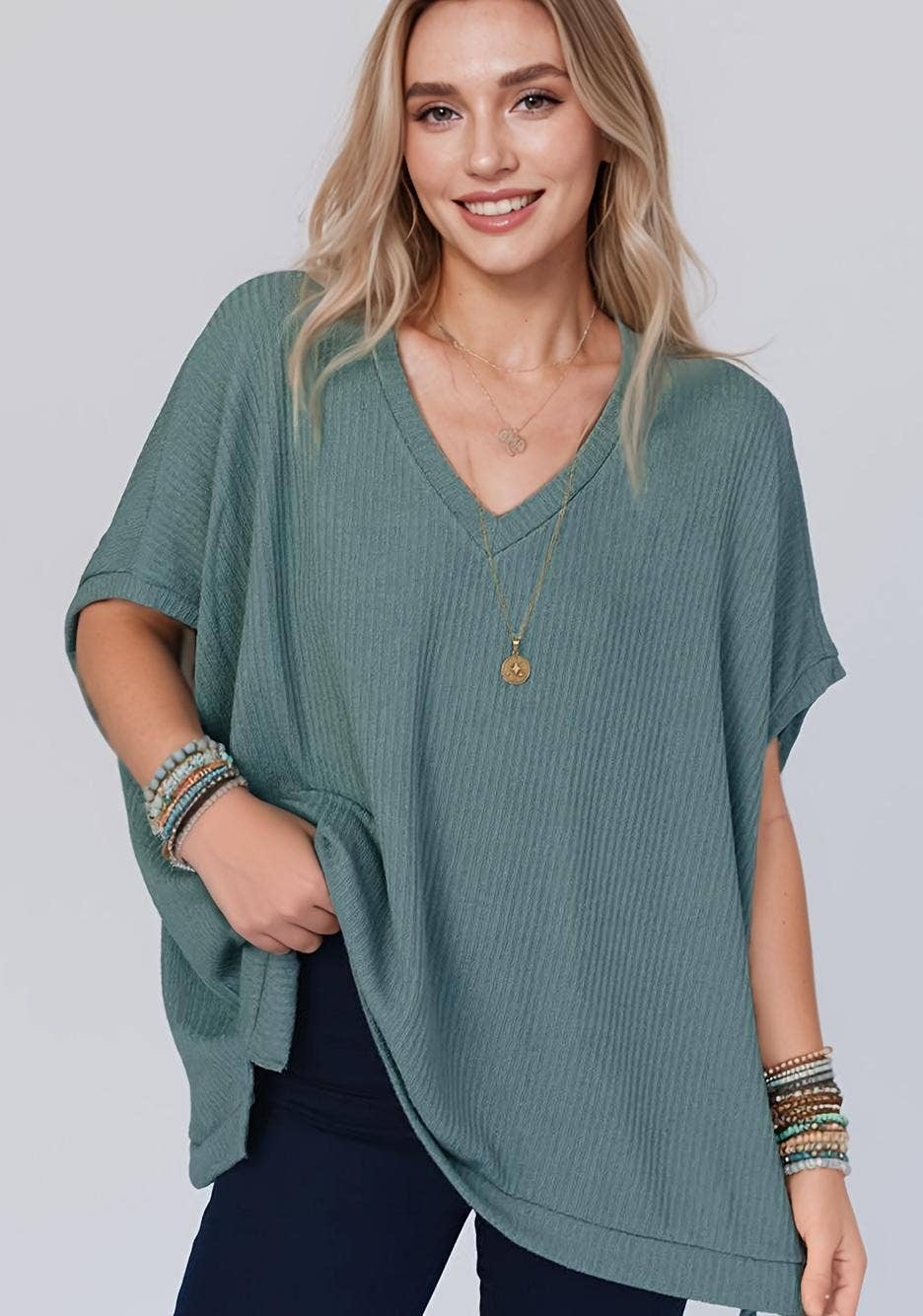 Embrace effortless comfort in this oversized ribbed knit top featuring a flattering V-neck, dolman short sleeves, and a soft, stretchy feel. Its slouchy fit and high-low hem with subtle side slits make it perfect for layering or lounging in style. A must-have for easygoing days.