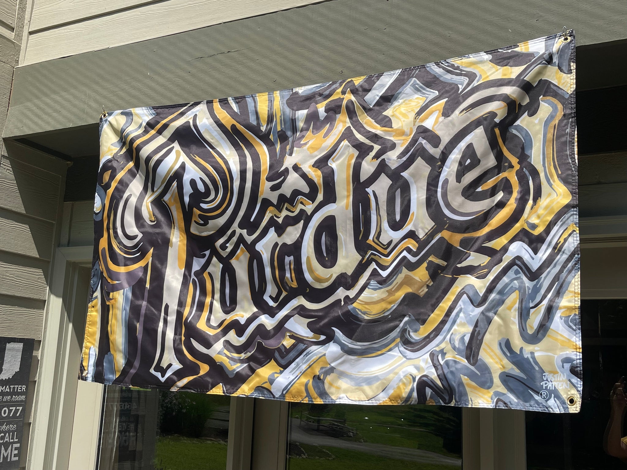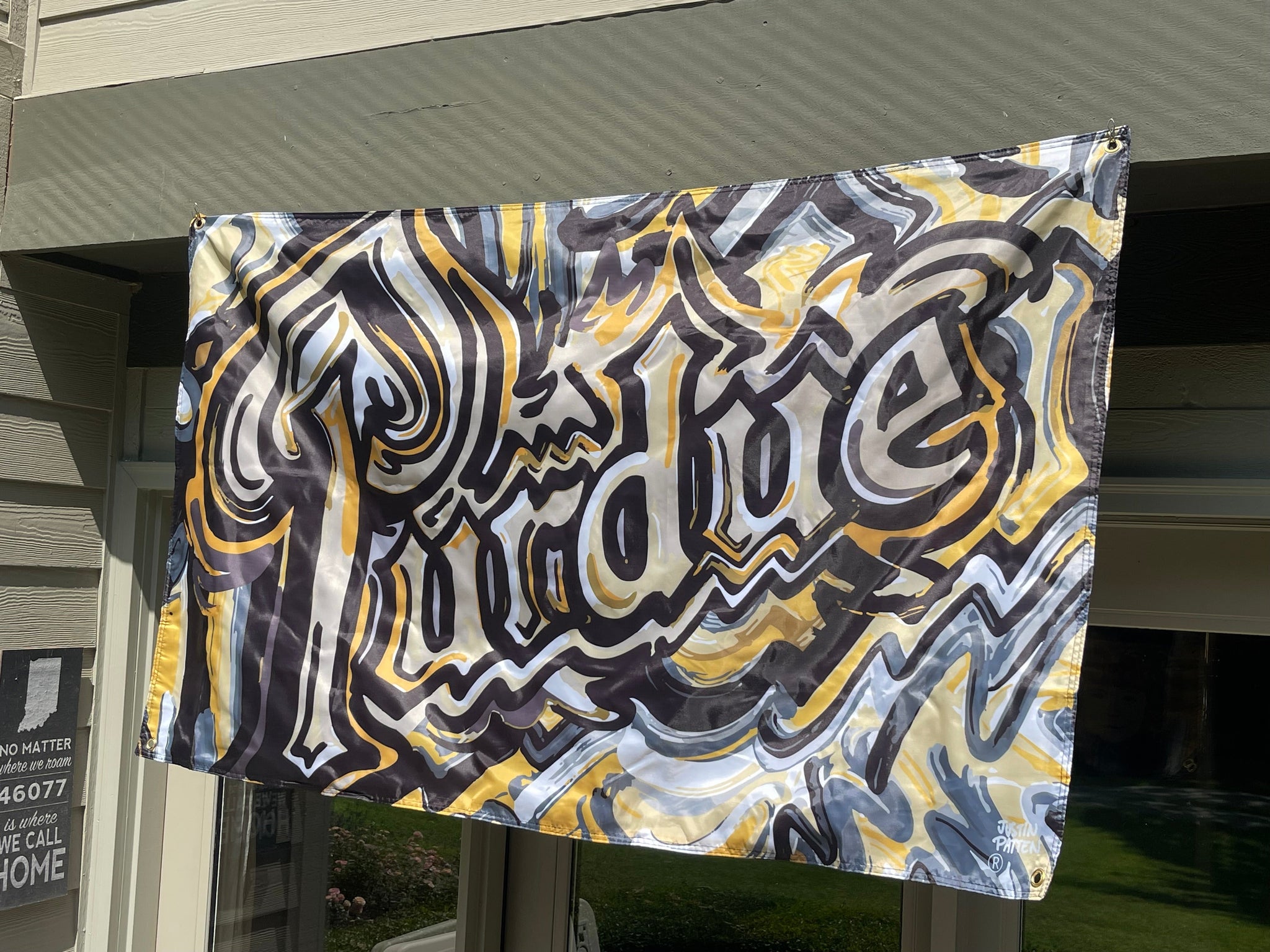 Justin Patten brings his unique, artistic style to Purdue with this 5'x 3' foot banner flag. This flag has 4 grommets to help you easily hang it. It is two sided.