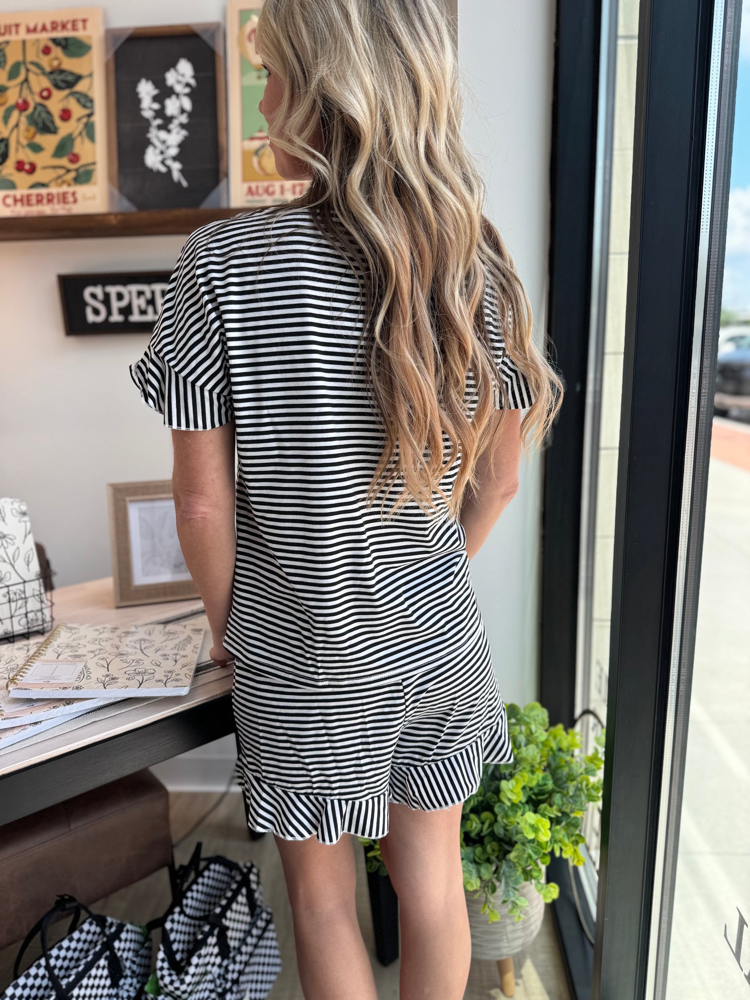 Step into effortless style with this striped top and short set, crafted from a soft stretch blend for all-day comfort. Featuring a round neck, short ruffle sleeves, and a playful striped print, this casual duo is perfect for everything from beach days to school outings. Lightweight and breathable, it’s your go-to warm-weather outfit.