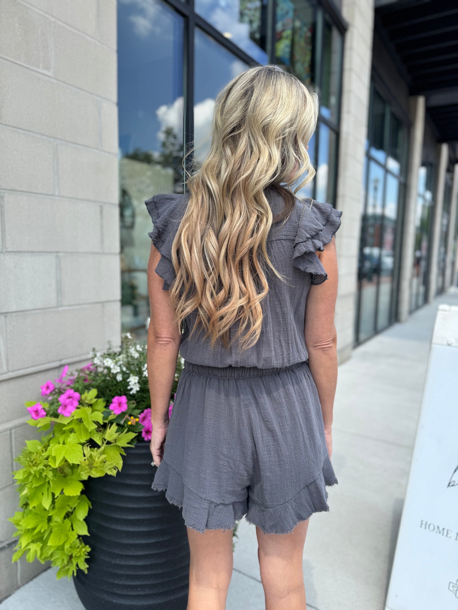 Meet your new spring/summer staple! This charcoal romper features playful ruffle details, a smocked waistband with drawstring, and soft 100% cotton fabric for all-day comfort. With front pockets and a relaxed silhouette, it’s perfect for casual days, beachwear, or effortless everyday style.